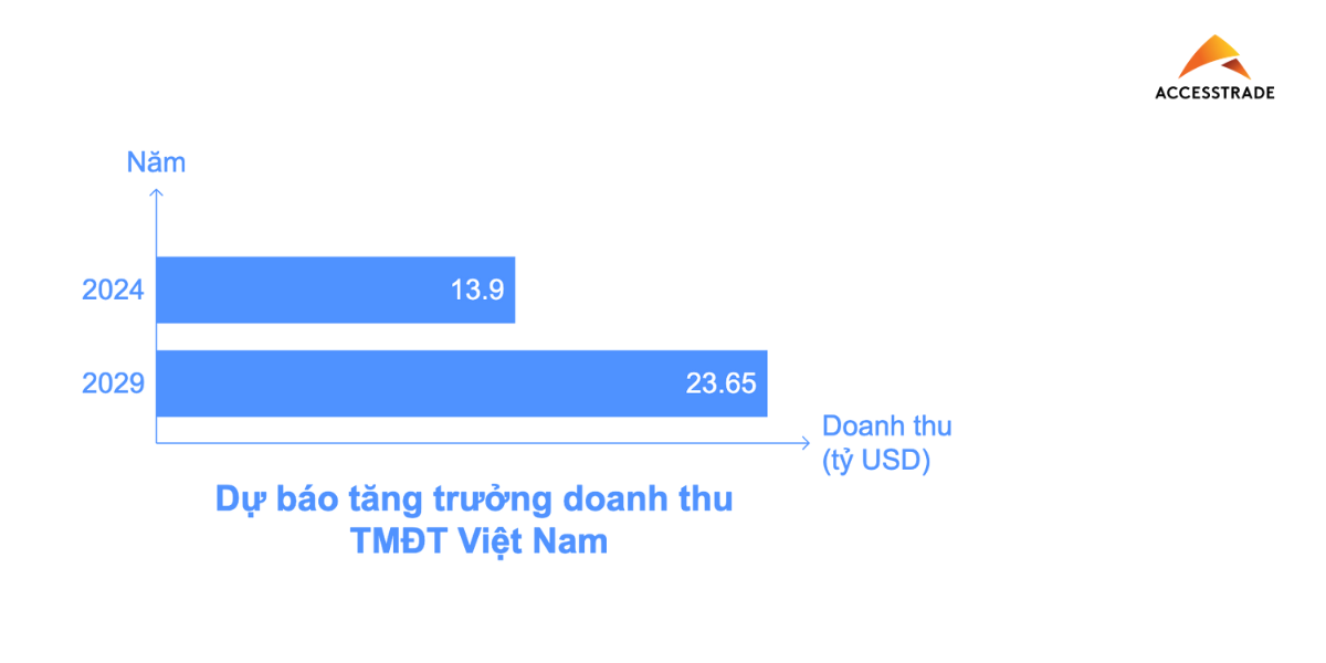 Theo báo cáo từ Statista (cập nhật tháng 10/2024), tổng doanh thu thị trường TMĐT Việt Nam đạt 13.9 tỷ USD trong năm 2024, với tốc độ tăng trưởng hàng năm (CAGR) 11,21% từ 2024-2029, đưa tổng giá trị lên 23.65 tỷ USD vào năm 2029.