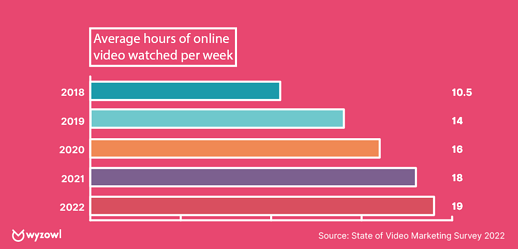 Theo Wistia, lượng video trực tuyến được xem trên mỗi người mỗi tuần đã tăng gần gấp đôi kể từ năm 2018, trong năm 2021 lên đến 18 giờ mỗi tuần.