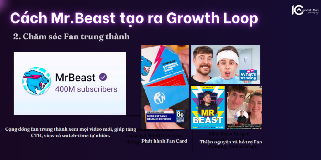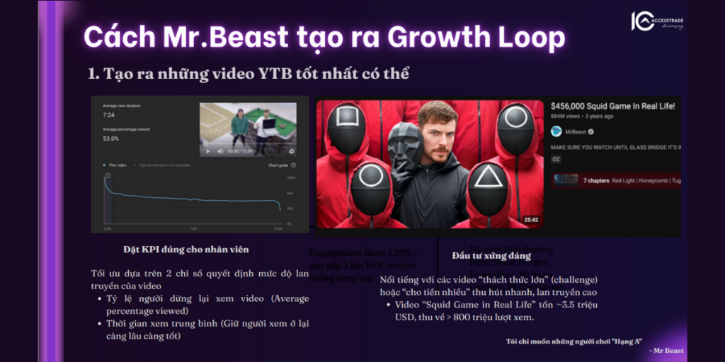Trong thế giới sáng tạo nội dung, MrBeast được xem là biểu tượng của tăng trưởng bền vững – không chỉ nhờ video triệu view mà nhờ một “vòng lặp” tinh vi giúp anh càng làm càng mạnh. ACCESSTRADE, sau hơn một thập kỷ quan sát và đồng hành cùng 2,8 triệu Publisher, đã nghiên cứu và đúc kết mô hình này thành “Growth Loops”. Bài viết dưới đây phân tích cách MrBeast vận hành vòng lặp thành công, và lý giải vì sao đây chính là hướng đi Creator Việt cần.