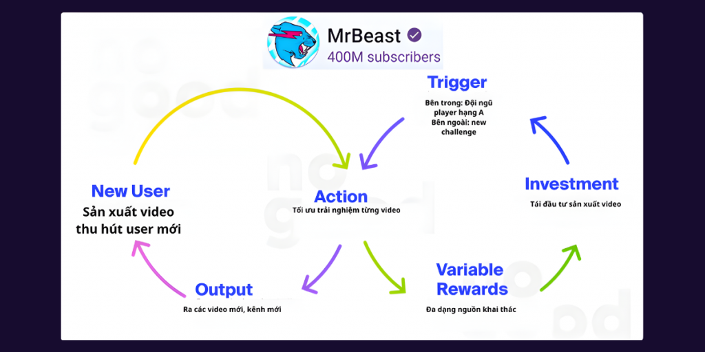 Nhờ cách làm này, thuật toán YouTube trở thành “đồng minh tự nhiên”. Khi video giữ chân người xem tốt, hệ thống tự động đẩy đề xuất, giúp MrBeast vào thẳng vòng tăng trưởng đầu tiên: Nội dung mạnh → giữ chân cao → đề xuất rộng → view tăng vọt → doanh thu tăng → nguồn lực tái đầu tư mạnh hơn. Vòng lặp khởi động ngay từ đây.