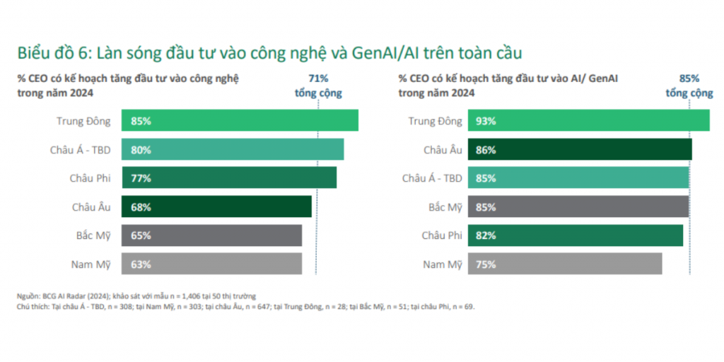 Doanh nghiệp Việt Nam ngày càng đẩy mạnh ứng dụng AI để tối ưu vận hành, cắt giảm chi phí và nâng cao trải nghiệm khách hàng. Theo báo cáo của Boston Consulting Group (BCG) 2024, 71% lãnh đạo dự định tăng mức đầu tư công nghệ cho công ty trong năm 2024. Đặc biệt, 85% trong số họ dự kiến sẽ tăng chi phí đầu tư cho AI và GenAI.