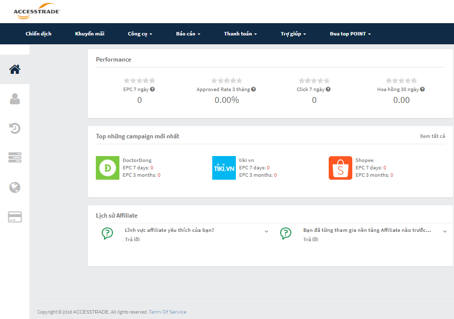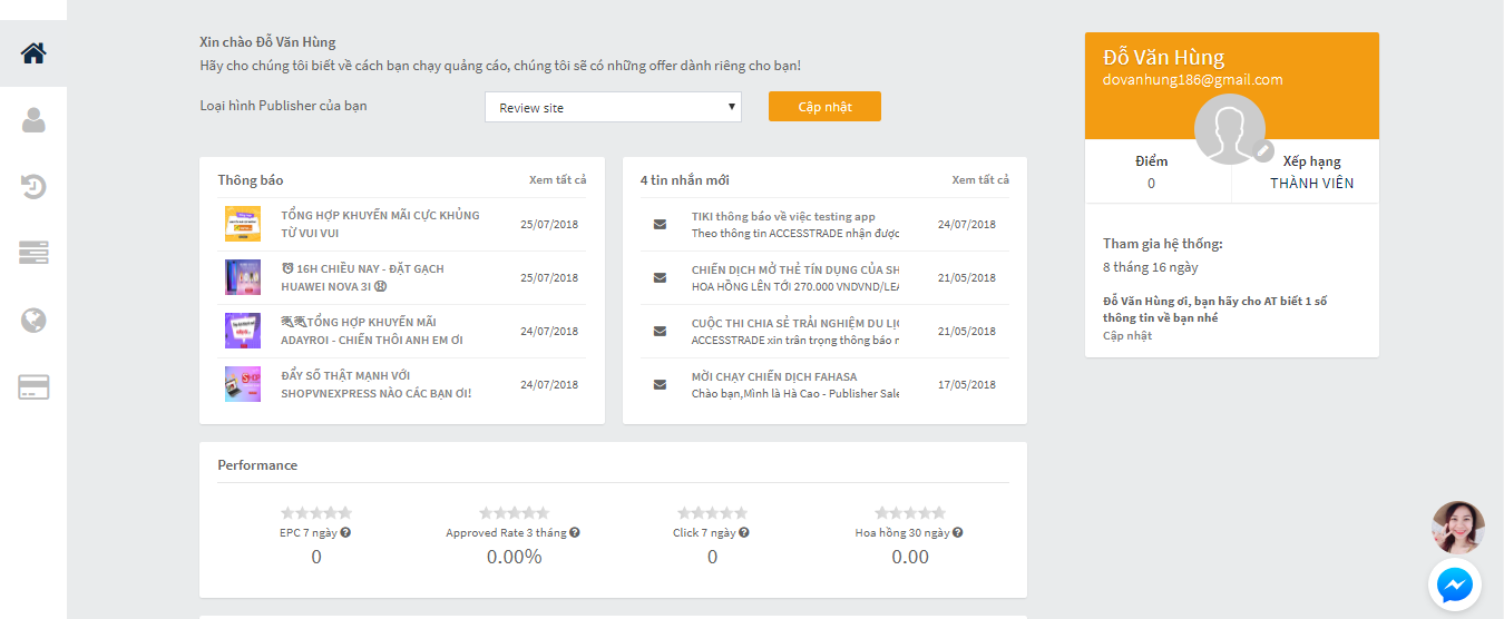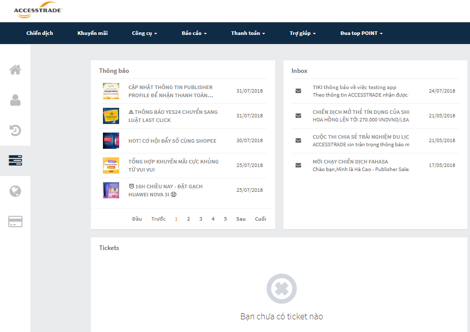 Trang chủ với mục đích chính là cung cấp cho các publisher những thông báo mới nhất về các chiến dịch đang hoạt động của ACCESSTRADE (Phần thông báo và tin nhắn). Nếu như trước đây, các thông tin này được gửi qua mail, việc các bạn vào mail và bỏ lỡ mail với những thông tin quan trọng là rất dễ xảy ra, khi mail của ACCESSTRADE bị lẫn với các email công việc khác của bạn. Thay vào đó, giờ đây chỉ cần vào mục trang chủ, bạn đã có được thông tin mới nhất về các chiến dịch đang hoạt động, thông báo về thay đổi mức hoa hồng, lịch đua top, vân vân và vân vân…