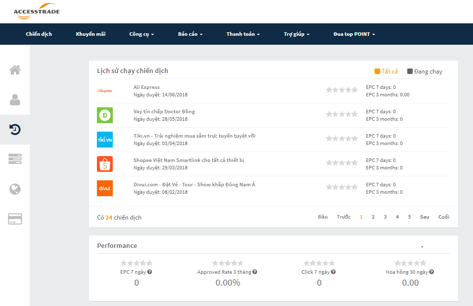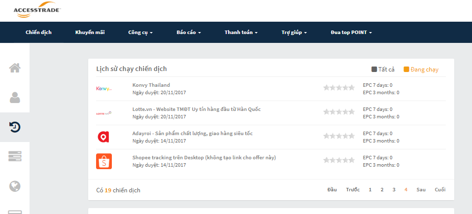 Phần lịch sử chiến dịch đang chạy cung cấp cho bạn thông tin về tất cả các chiến dịch bạn đã từng chạy và những chiến dịch đang hoạt động hiện tại. Để biết tổng số chiến dịch bạn đã từng chạy từ khi tham gia với ACCESSTRADE, bạn tích vào phần tất cả. Như đối với tài khoản của mình thì đó là 24 chiến dịch. Trong khi những chiến dịch hiện tại đang hoạt động chỉ là 19 chiến dịch mà thôi.