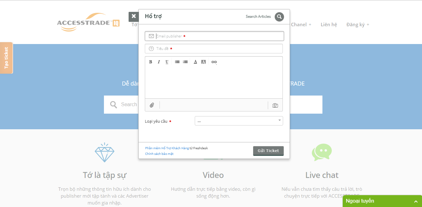 Để tạo ticket, bạn vào trang Https://help.accesstrade.vn và chọn nút bên góc trái màn hình. Form ticket của bạn sẽ được hiện ra và bạn có thể đặt câu hỏi về vấn đề của mình với ACCESSTRADE để được hỗ trợ.