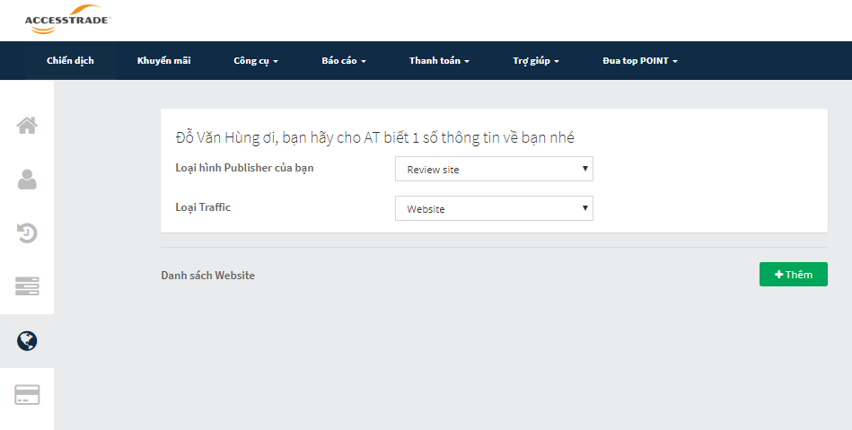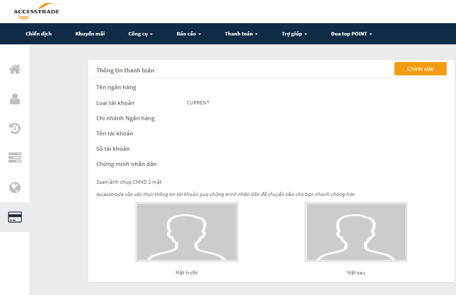 Đây là nơi bạn cập nhật các thông tin liên quan đến tài khoản nhận thanh toán, ACCESSTRADE sẽ thanh toán hoa hồng hàng tháng dựa trên những thông tin này.