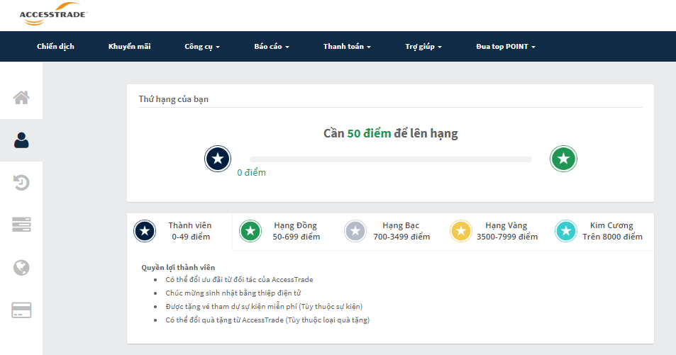 Tại phần này ngoài mục thông tin cá nhân của publisher (Bao gồm họ tên, số điện thoại, nơi ở email, Access Key, Serect Key, Source ID) ACCESSTRADE còn cung cấp cho các bạn một tính năng rất hữu ích đó là Thứ hạng thành viên của bạn. Việc xếp hạng của bạn với các mức từ Thành viên, Hạng đồng, Hạng Bạc, Hạng vàng, Kim cương dựa trên số AT Super Point của bạn.