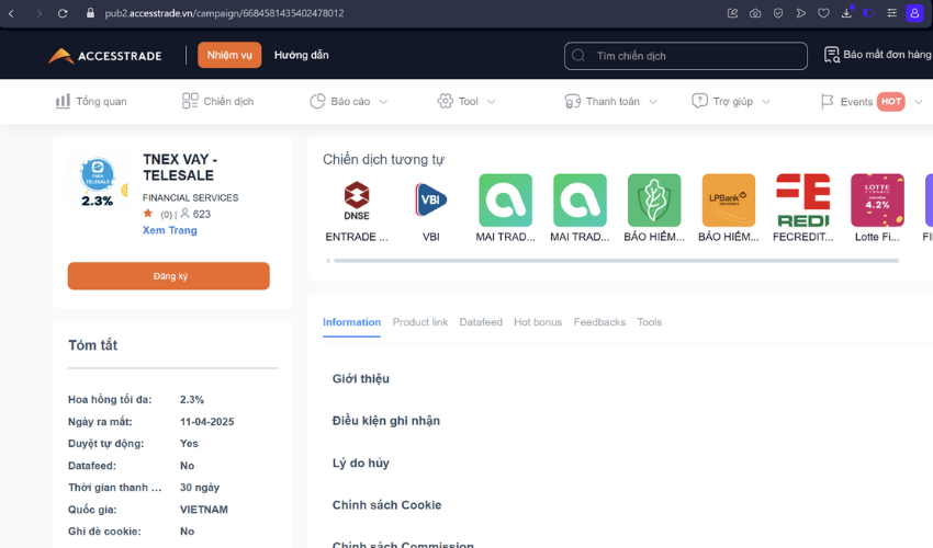 Sau khi đăng nhập vào ACCESSTRADE, bạn vào truy cập chiến dịch Tnex Vay – Telesale và nhấn “Đăng ký” ngay cạnh chiến dịch. Hệ thống sẽ duyệt trong vài phút, và bạn sẽ nhận thông báo khi tham gia thành công.