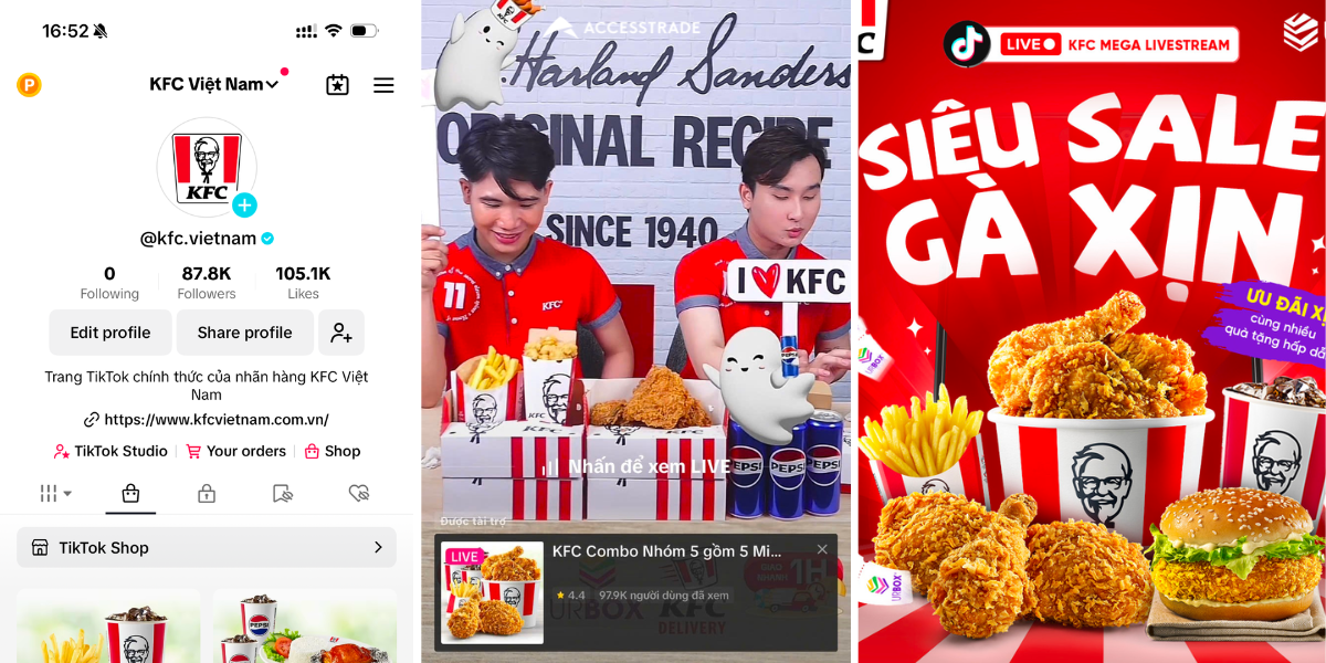 Một ngày, chúng ta thấy thương hiệu gà rán nổi tiếng KFC không chỉ xuất hiện trên app đặt hàng thức ăn, hotline truyền thống mà trên Livestream của TikTok Shop. Chọn những khung giờ vàng để “tấn công” thị hiếu của khách hàng như thời điểm trước ăn trưa và ăn chiều, sự xuất hiện bất ngờ và liên tục đã thu hút hàng nghìn mắt xem. Sau chiến dịch KFC đã đạt được hơn 30,000 đơn hàng và mang về 1,2 tỷ đồng doanh thu chỉ trong 2 tháng với hình thức livestream. KFC không chỉ chứng tỏ tiềm năng của ngành công nghiệp F&B, sự năng động của thương mại điện tử mà còn gợi mở cơ hội cho nhiều ngành nghề khác sử dụng công cụ quảng bá này.
