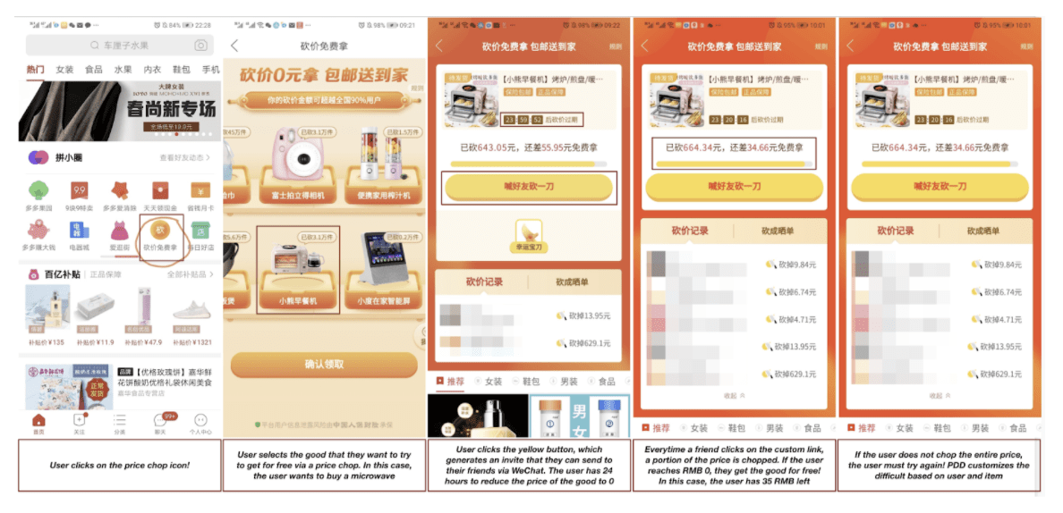 Cũng như Điểm Danh Thường Nhật, Chém giá khuyến khích người dùng gắn kết với PDD và cuối cùng là thúc đẩy họ tới việc đặt hàng trên sàn thương mại điện tử này. Nhưng khác với DDTN, Chém giá khuyến khích người dùng bằng cách chia sẻ PDD với các mối quan hệ xã hội của mình.