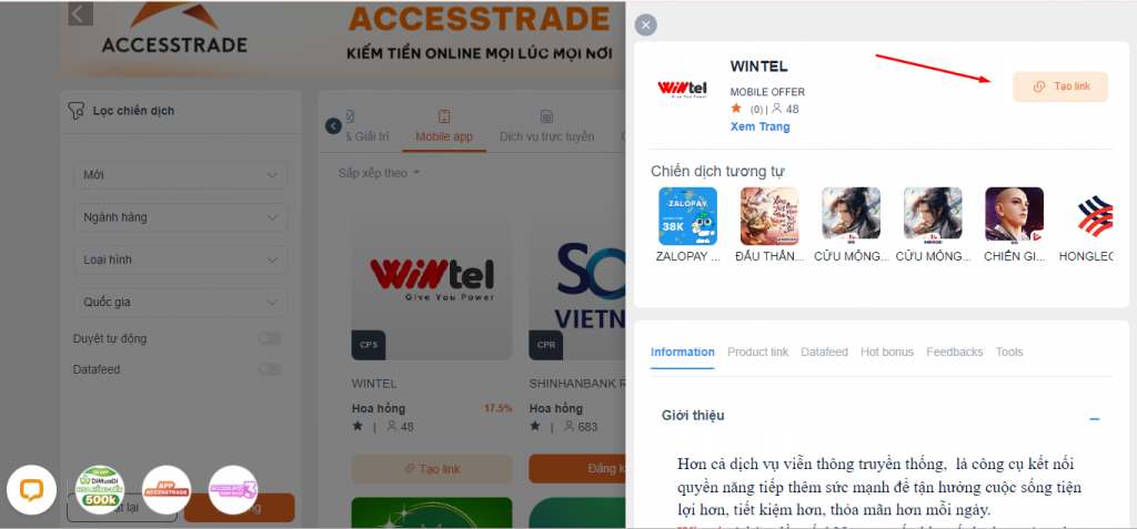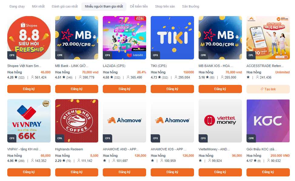 Bạn đăng nhập vào tài khoản Publisher của ACCESSTRADE, chọn Chiến dịch, chọn Mobile app. Chọn chiến dịch bạn muốn tham gia và chọn Đăng ký