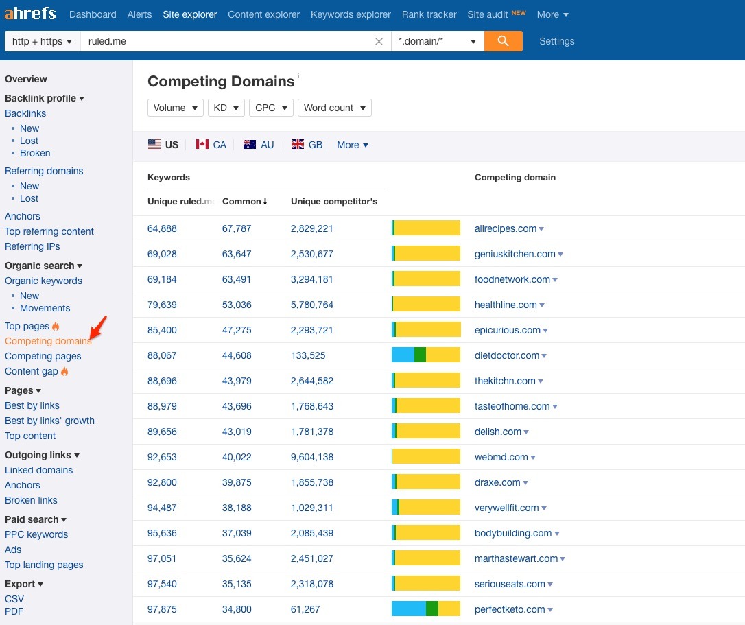 Chúng ta đã có được danh sách đối thủ. Tiếp theo, mình lại sử dụng Ahrefs để có cái nhìn bao quát hơn về họ. Lấy ví dụ cụ thể là website Rules.me