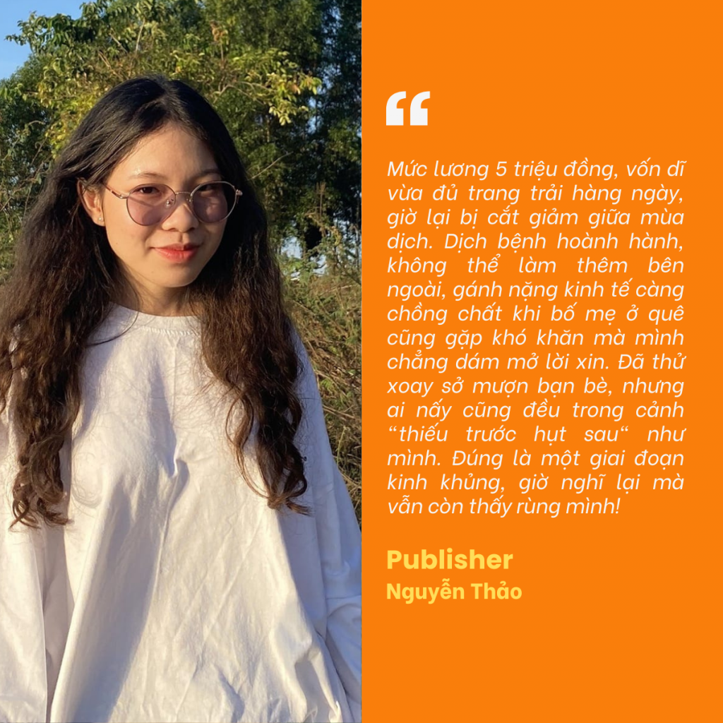 Thảo tốt nghiệp đầu năm 2020. Trong khi bạn bè còn đang chật vật với hồ sơ xin việc, Thảo đã may mắn kiếm được công việc lương 5 triệu/tháng – một mức thu nhập tối thiểu ở các thành phố lớn. Nhưng rồi, dịch ập đến. Công ty cắt giảm ngân sách, lương bị giảm sâu. Từ mức đủ ăn đủ ở, Thảo rơi vào trạng thái âm lương nếu lỡ tay tiêu lố một chút.