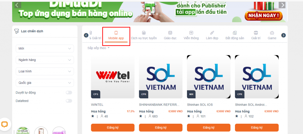 Tại đây, các chiến dịch kiếm tiền được phân bổ theo các tiêu chí như ngành hàng, thời gian duyệt, loại,… giúp các Publisher dễ dàng lựa chọn các chiến dịch phù hợp cho mình hoặc có thể tìm kiếm chiến dịch mà các Publisher muốn tham gia tại thanh tìm kiếm.