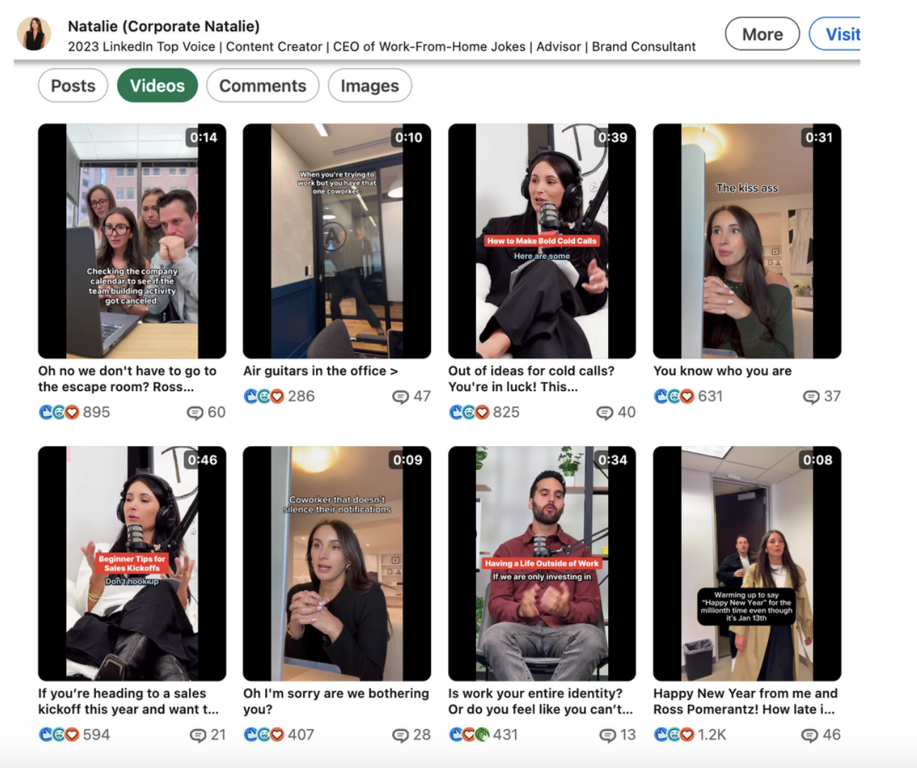 Một trong những gương mặt nổi bật trong làn sóng sáng tạo video trên LinkedIn là Natalie “Corporate Natalie” Marshall. Cô được biết đến với những video hài hước về cuộc sống công sở, thu hút gần 150.000 người theo dõi trên LinkedIn, bên cạnh 1,1 triệu người theo dõi trên Instagram và khoảng 735.000 trên TikTok.