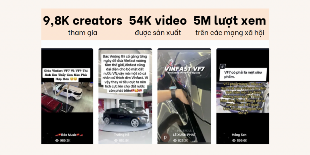 Kết quả của chiến dịch V-Creator là minh chứng rõ ràng cho sự thành công của mô hình này: chỉ trong vòng 3 tháng, chương trình đã thu hút 9,8K creators tham gia, tạo ra 54K video và đạt được 5 triệu lượt xem trên các nền tảng mạng xã hội. V-Creator không chỉ là một chiến dịch marketing mà còn là mô hình bền vững, nơi mà thương hiệu và cộng đồng cùng phát triển. Bằng việc đầu tư vào cộng đồng sáng tạo, VinFast đã chứng minh rằng việc kết hợp UGC với Affiliate và dịch vụ KOC Ambassador không chỉ mang lại kết quả kinh doanh ấn tượng mà còn xây dựng được giá trị thương hiệu lâu dài và sâu sắc.