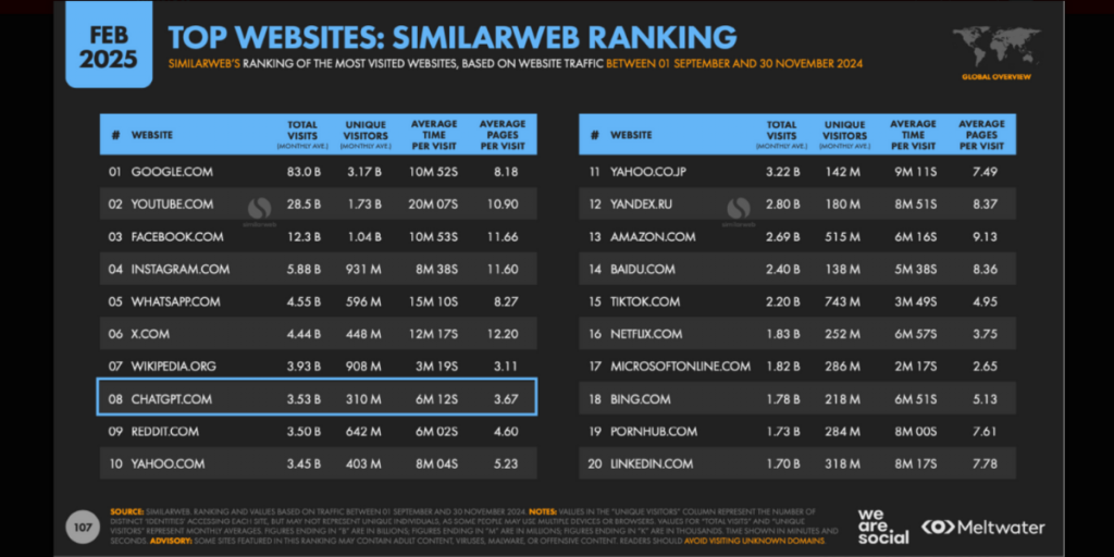 Đặc biệt, ChatGPT không chỉ đứng đầu về mức độ sử dụng mà còn lọt vào danh sách các ứng dụng được tải xuống nhiều nhất toàn cầu, đứng thứ tám trong bảng xếp hạng của data.ai. Việc này phản ánh sự chuyển dịch rõ rệt trong thói quen người dùng, khi AI ngày càng đóng vai trò quan trọng trong việc tìm kiếm thông tin, sáng tạo nội dung, và tương tác trên các nền tảng mạng xã hội.
